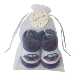 Newborn Baby Boys Socks Booties Boots Style With Organza Bag Blue Car